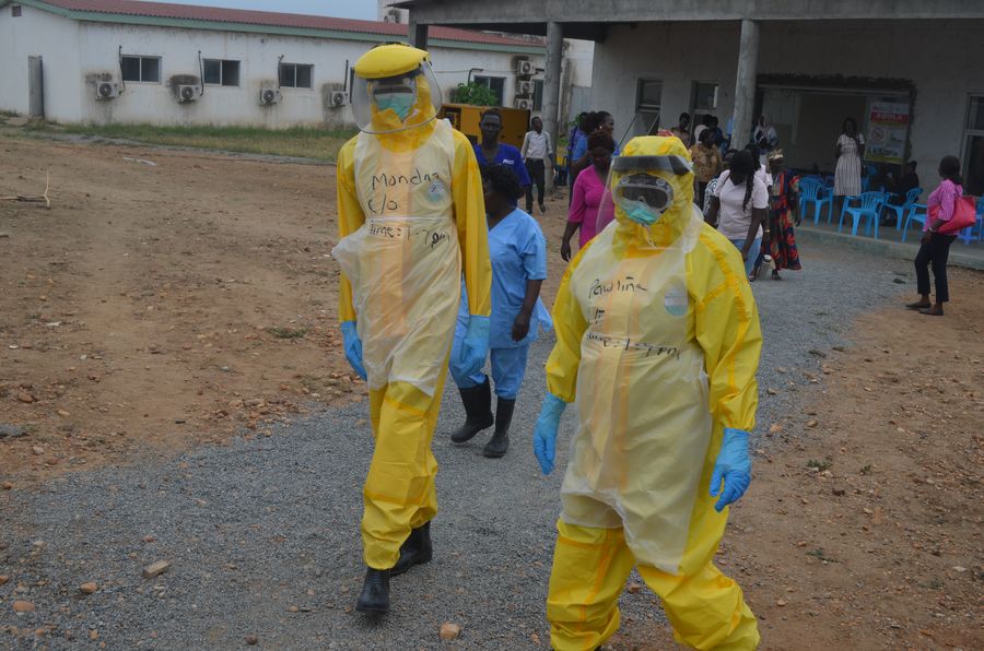 South Sudanese medical workers demonstrate preventive measures against COVID-19 at the National Public Health Center in Juba, capital of South Sudan, April 3, 2020. (Xinhua/Denis Elamu)