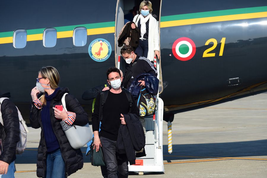 Volunteer nurses arrive at Bologna Guglielmo Marconi airport in Italy, April 4, 2020.(Photo by Gianni Schicchi/Xinhua)