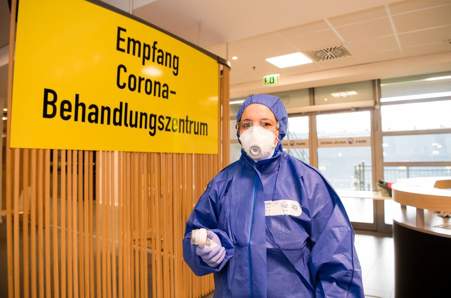 Photo taken on April 3, 2020 shows a medical staff wearing protective suits, standing in the COVID-19 testing center at Borussia Dortmund's stadium in Dortmund, Germany.(Photo by Alexandre Simoes/Borussia Dortmund via Xinhua)