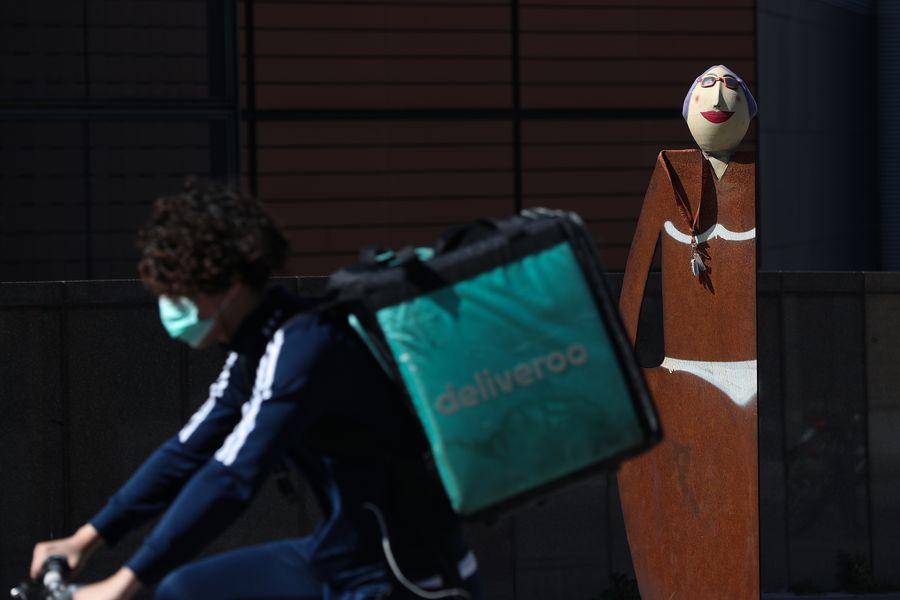 A delivery man wearing a mask passes by a statue in Brussels, Belgium, April 6, 2020.(Xinhua/Zheng Huansong)