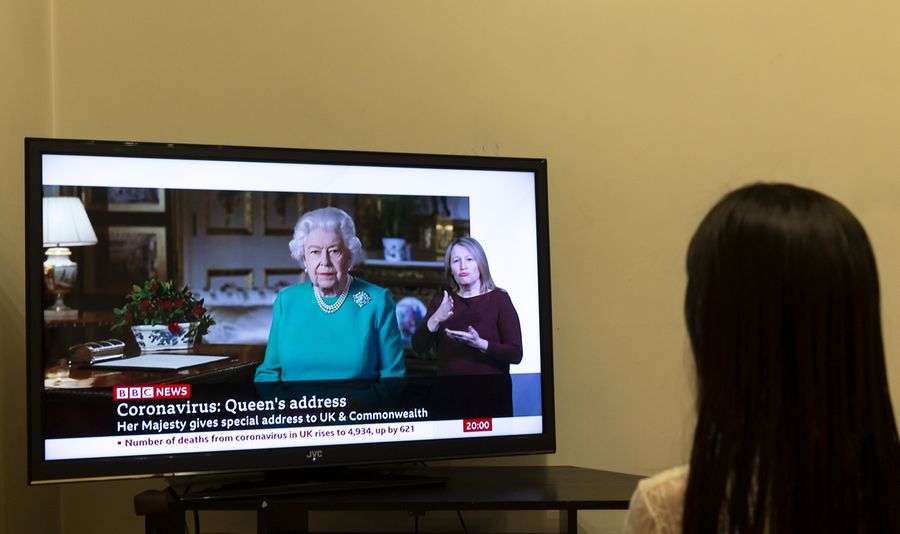A girl watches British Queen Elizabeth II's address on TV in London, Britain, on April 5, 2020.(Xinhua/Han Yan)