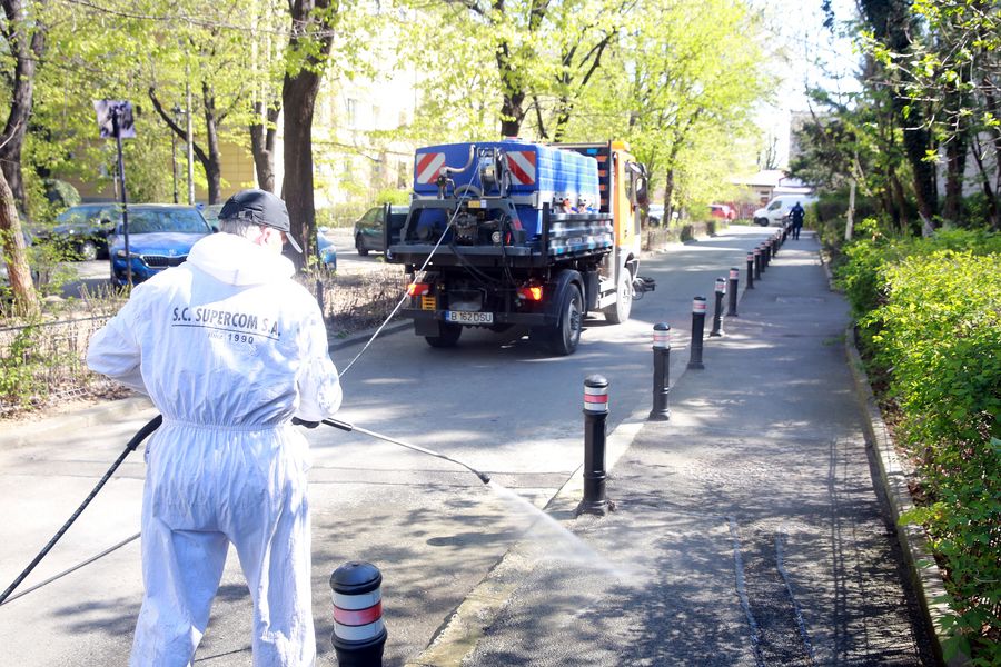 A worker conducts disinfection as a measure to curb the spread of COVID-19 in Bucharest, Romania on April 6, 2020. (Photo by Gabriel Petrescu/Xinhua)