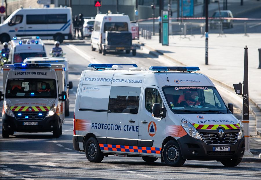 Ambulances head to the Gare d'Austerlitz train station to evacuate coronavirus patients from the Ile-de-France region to the Brittany region to free up intensive care beds in Paris, France, April 1, 2020.(Photo by Aurelien Morissard/Xinhua)