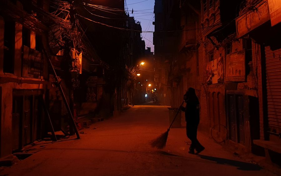 A sanitation worker sweeps an empty street in Kathmandu, capital of Nepal, April 5, 2020. (Xinhua/Sunil Sharma)