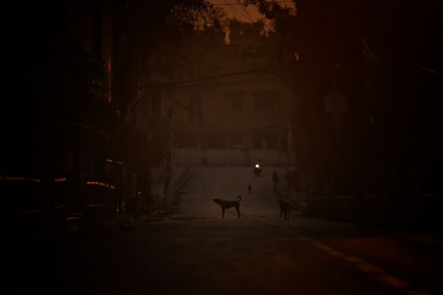 Dogs walk on a street during the 11th day of lockdown in Kathmandu, Nepal, April 3, 2020. (Xinhua/Sulav Shrestha)
