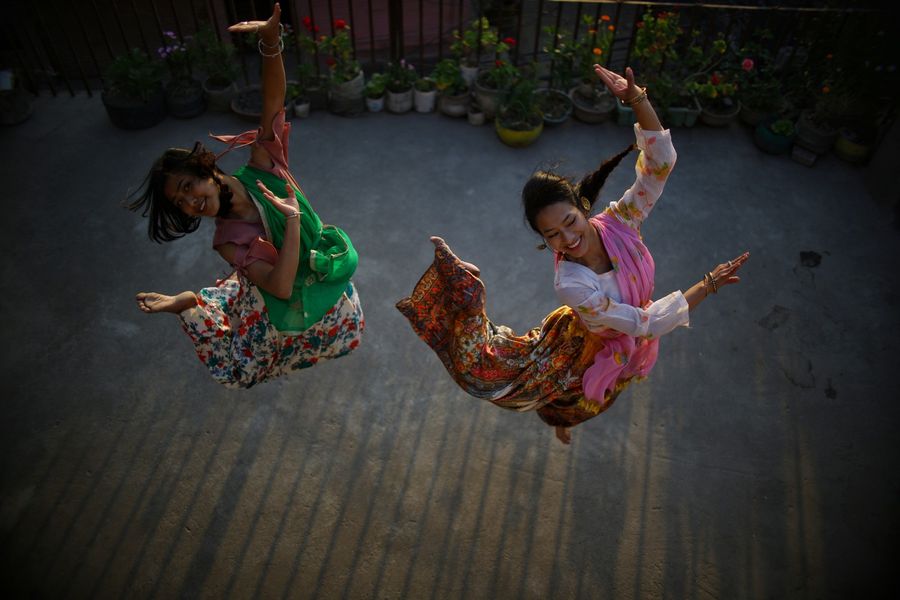 Shristi Maharjan (R) dances with a friend on the roof terrace of her house in Kathmandu, Nepal on April 4, 2020. (Xinhua/Sulav Shrestha)