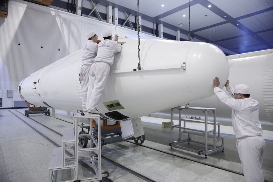 Chinese space engineers install parachutes and control devices on a booster of Long March-3B carrier rocket. (Photo provided by CALT)