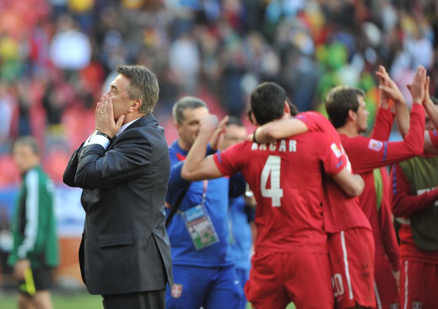 Radomir Antic (L), head coach of Serbia greets the audience after the 2010 World Cup Group D soccer match against Germany at the Nelson Mandela Bay stadium in Port Elizabeth, South Africa, on June 18, 2010. Serbia won 1-0. (Xinhua/Yang Lei)