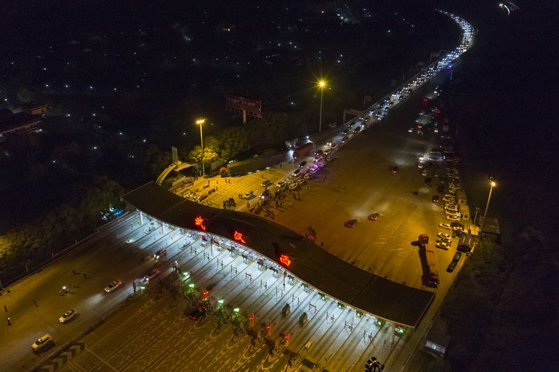 Aerial photo taken on April 8, 2020 shows cars passing an expressway toll station in western Wuhan, central China's Hubei Province. (Xinhua/Shen Bohan)