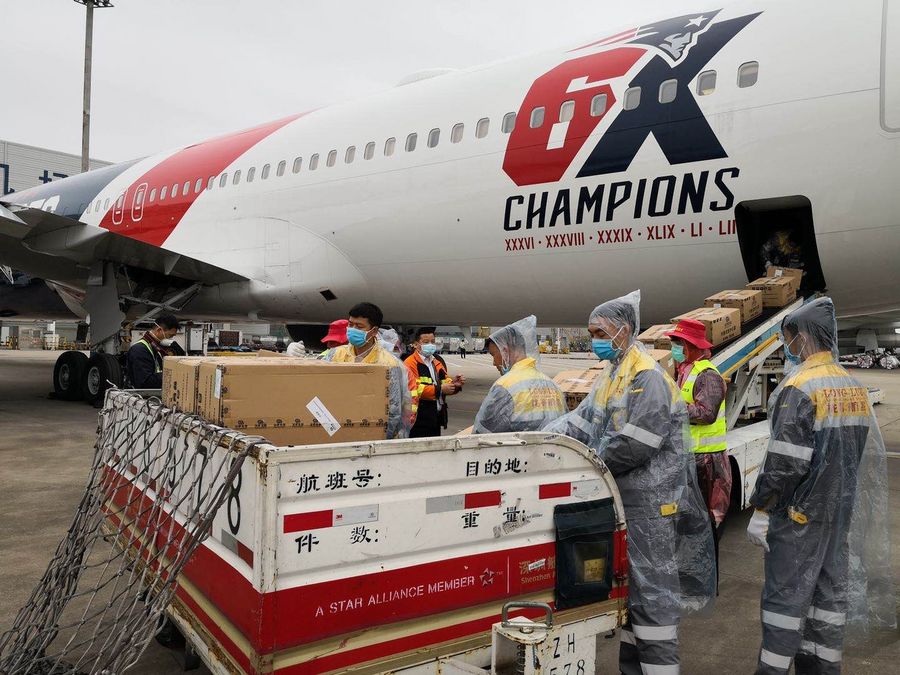 Staff members load medical supplies to the chartered plane from the U.S. at Shenzhen Bao'an International Airport in south China's Guangdong Province, April 1, 2020. (Tencent/Handout via Xinhua)