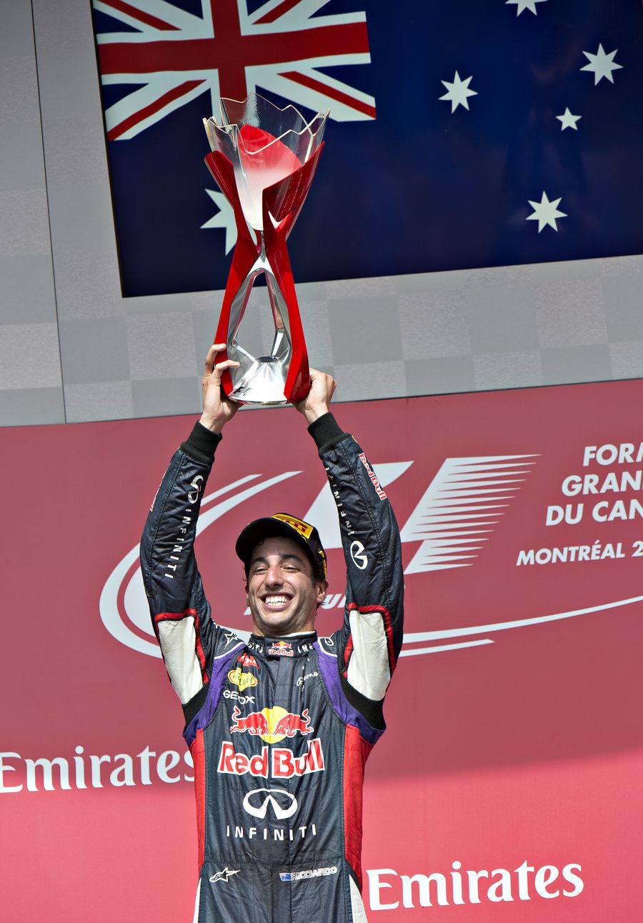 Red Bull Formula One driver Daniel Ricciardo of Australia holds up the trophy after winning the Canadian Grand Prix in Montreal, Canada, June 8, 2014. (Xinhua/Andrew Soong)