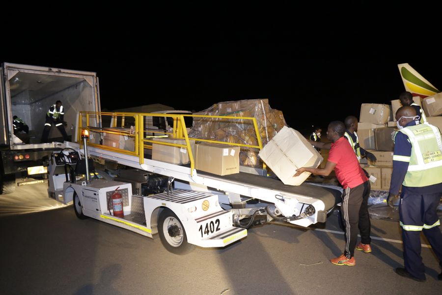 Staff members unload the medical supplies from China at the airport in Addis Ababa, Ethiopia, March 22, 2020. (Xinhua/Wang Shoubao)