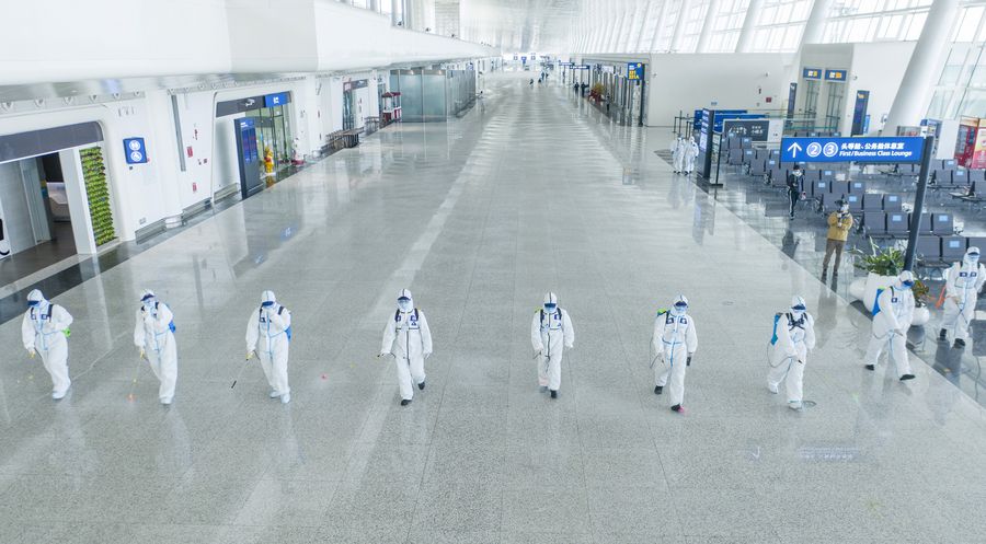 Aerial photo taken on April 3, 2020 shows firefighters conducting disinfection at the Terminal 3 of Wuhan Tianhe International Airport in Wuhan, central China's Hubei Province. (Xinhua/Cai Yang)