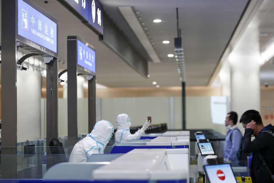 A border inspection police officer checks information of a newly arrived inbound passenger in Chongqing, southwest China, March 29, 2020. (Xinhua/Huang Wei)