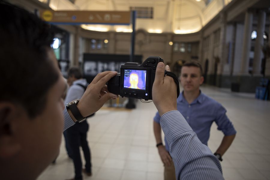 A staff member checks the body temperature of a passenger at a train station in Buenos Aires, Argentina, March 20, 2020. (Xinhua/Martin Zabala)