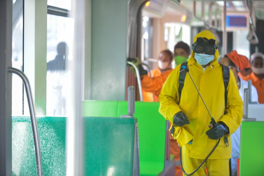 An official sprays disinfectant on a train in Addis Ababa, capital of Ethiopia, March 21, 2020. (Xinhua/Michael Tewelde)