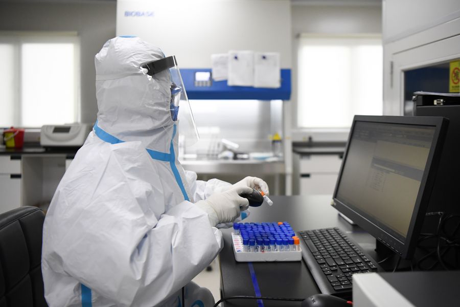 A staff member does nucleic acid testing work at Weishi Medical Diagnostics, a third-party nucleic acid test institute, in Changsha, central China's Hunan Province, March 10, 2020. (Xinhua/Xue Yuge)