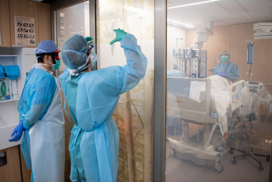 Medical staff discuss about the treatment for COVID-19 patients at a hospital in Barcelona, Spain, April 9, 2020. (Photo by Francisco Avia/Xinhua)■