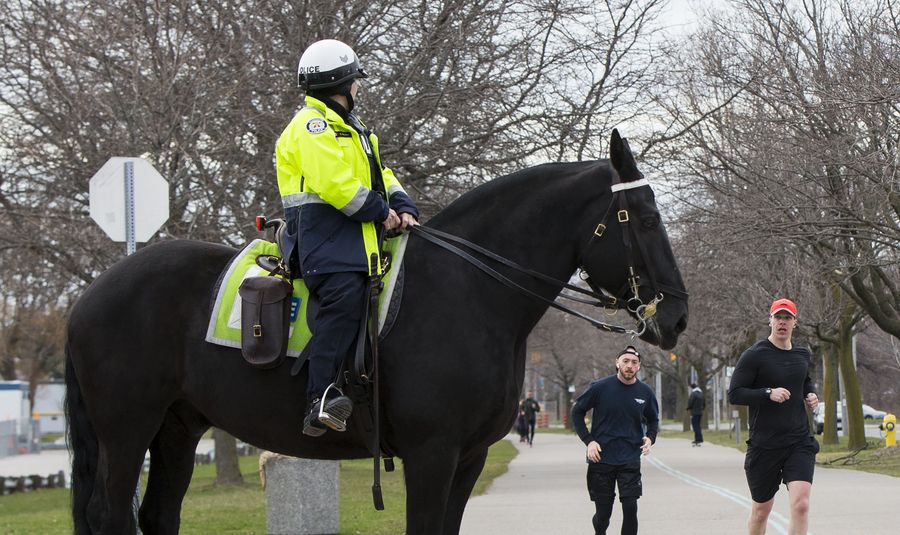 A mounted police officer on duty is seen at a trail in Toronto, Canada, April 4, 2020. (Photo by Zou Zheng/Xinhua)