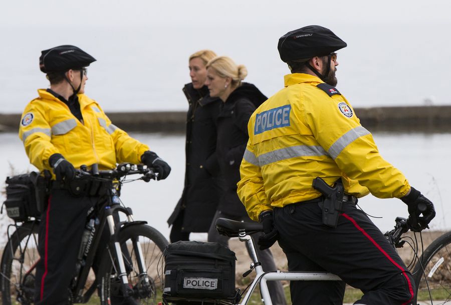 Police officers on duty are seen at a trail in Toronto, Canada, April 4, 2020. (Photo by Zou Zheng/Xinhua)