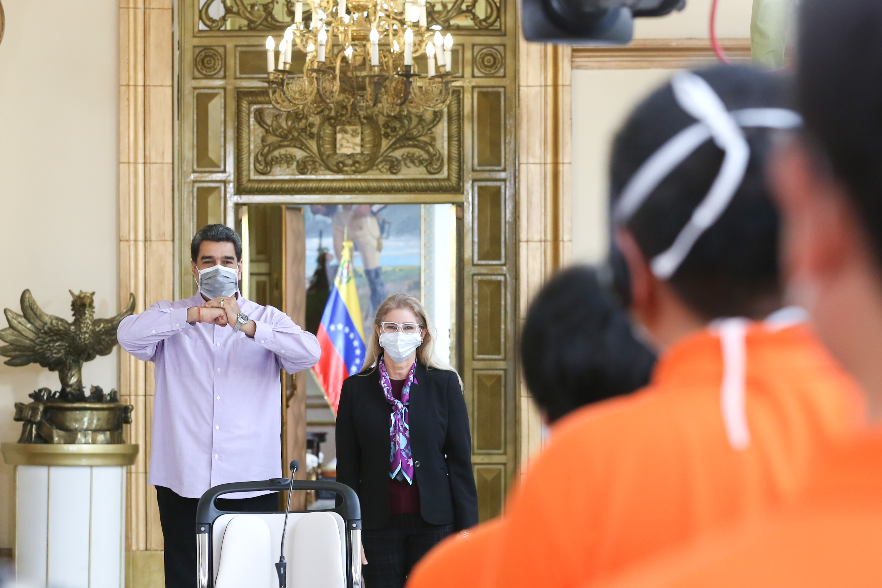 Venezuelan President Nicolas Maduro(L) greets the Chinese medical experts in Caracas, Venezuela, April 8, 2020. (Venezuela's Presidency/Handout via Xinhua)
