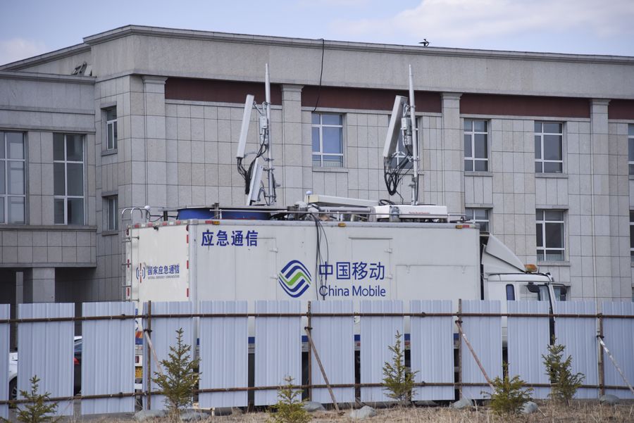 An emergency communication vehicle is seen at the construction site of a temporary hospital in Suifenhe, northeast China's Heilongjiang Province, April 10, 2020. (Xinhua/Dong Baosen)■