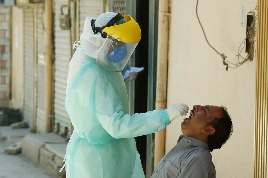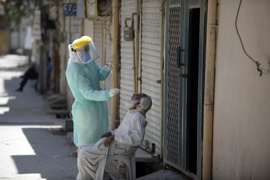 A medical staff member wearing a protective suit collects samples for screening test of COVID-19 on a street during lockdown on the outskirts of Islamabad, Pakistan, on April 10, 2020. (Xinhua/Ahmad Kamal)