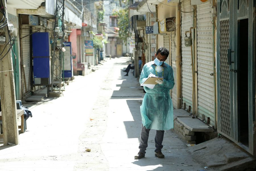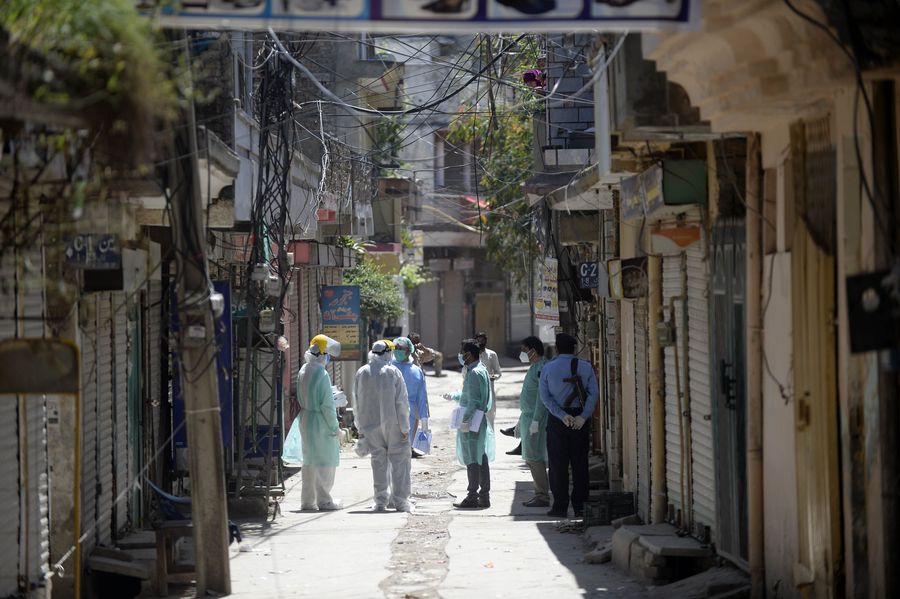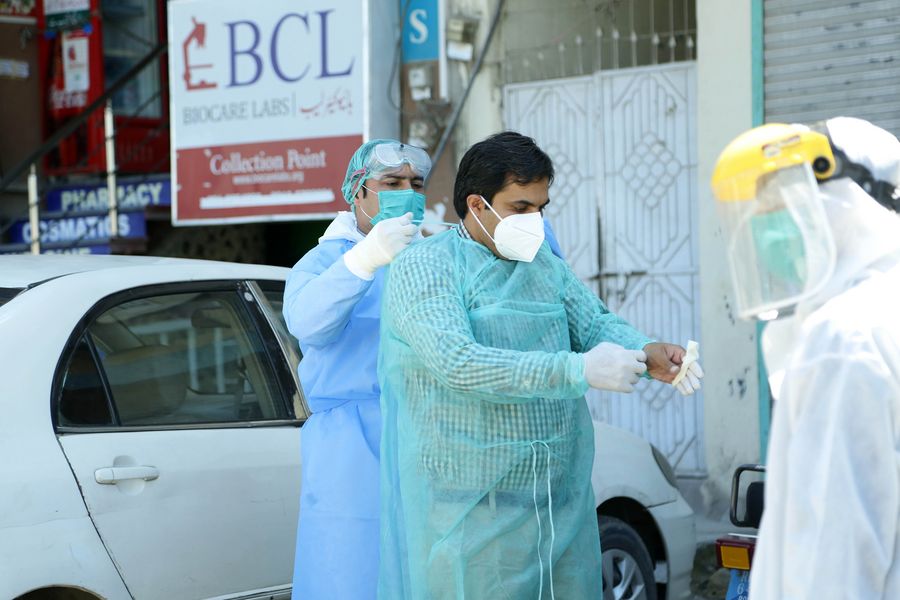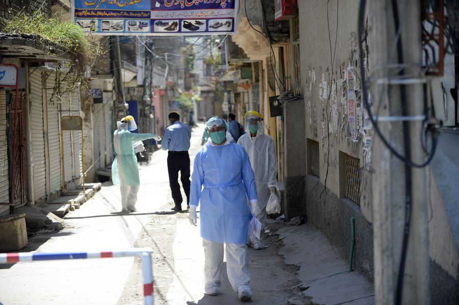 Medical staff members prepare to conduct screening test of COVID-19 at a residential area during lockdown on the outskirts of Islamabad, Pakistan, on April 10, 2020. (Xinhua/Ahmad Kamal)
