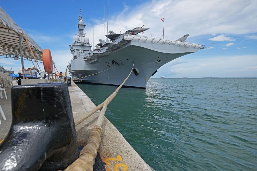 French aircraft carrier Charles de Gaulle is docked at Changi Naval Base, Singapore, May 28, 2019. (Xinhua/Then Chih Wey)■