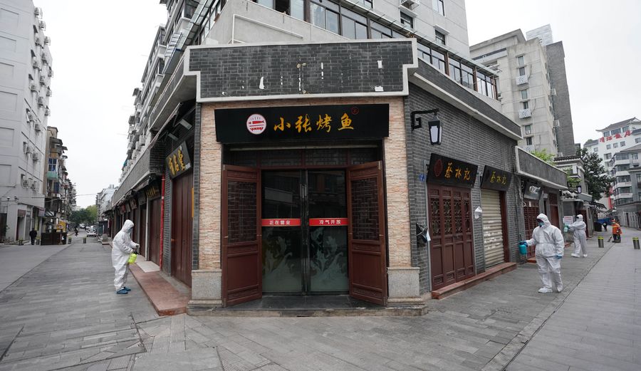 Staff members disinfect the Hubuxiang, a noted snack street, in Wuhan, central China's Hubei Province, April 11, 2020. (Xinhua/Wang Yuguo)