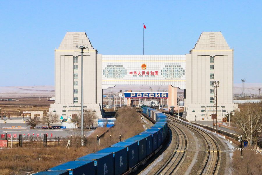 A freight train departing from Manzhouli City in north China's Inner Mongolia Autonomous Region passes through China-Russia border on Feb. 19, 2020. (Xinhua/Guo Nailun)