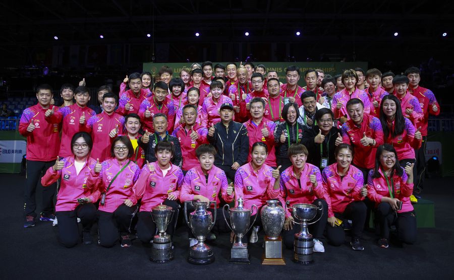 Chinese Table Tennis Team pose for a group photo after taking all trophies on offer at the 2019 ITTF World Table Tennis Championships in Budapest, Hungary on April 28, 2019. (Xinhua/Han Yan)