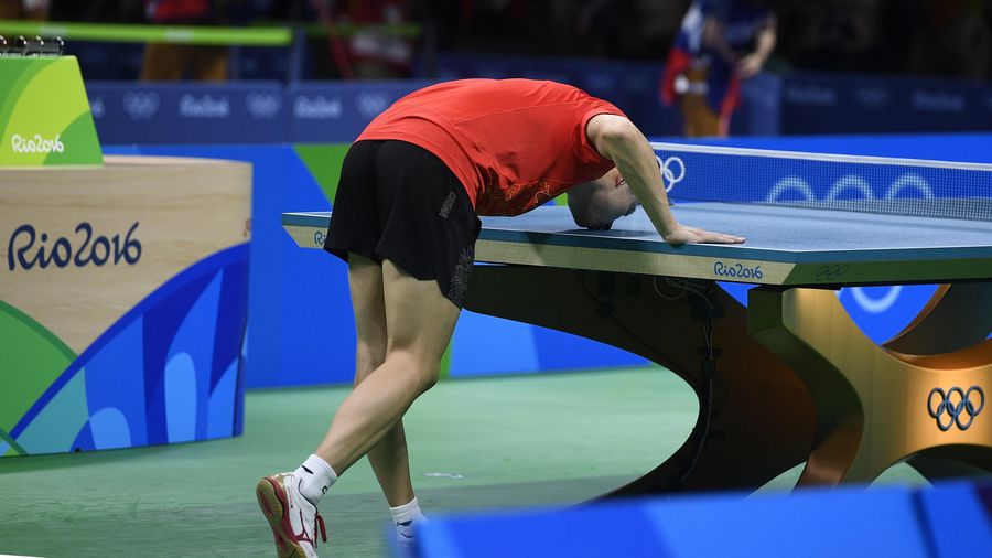 China's Ma Long reacts during the men's team gold medal match of Table Tennis against Japan at the 2016 Rio Olympic Games in Rio de Janeiro, Brazil, on Aug. 17, 2016. China won the gold medal. (Xinhua/Wang Peng)
