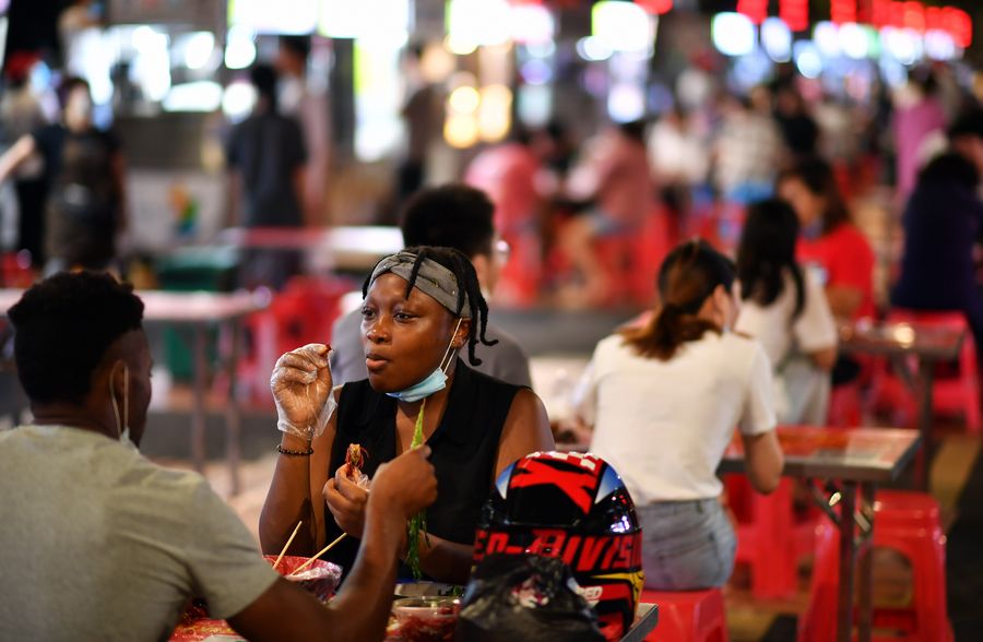 Foreigners eat snacks at a night market in Haikou, capital of south China's Hainan Province, March 26, 2020. (Xinhua/Guo Cheng)