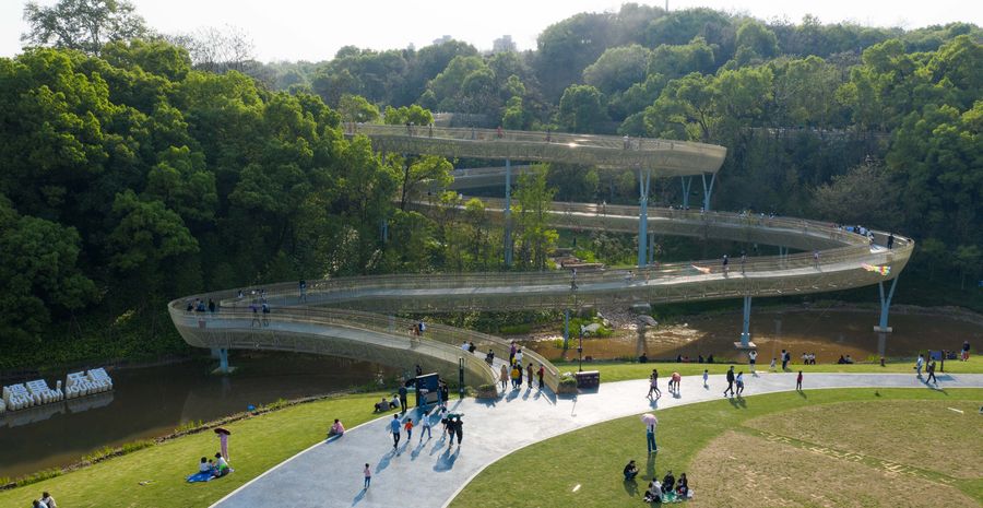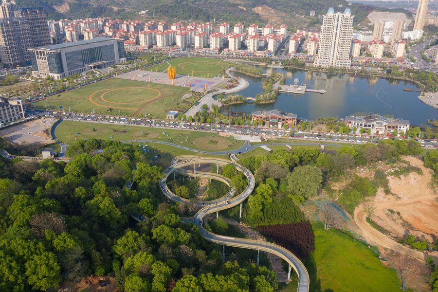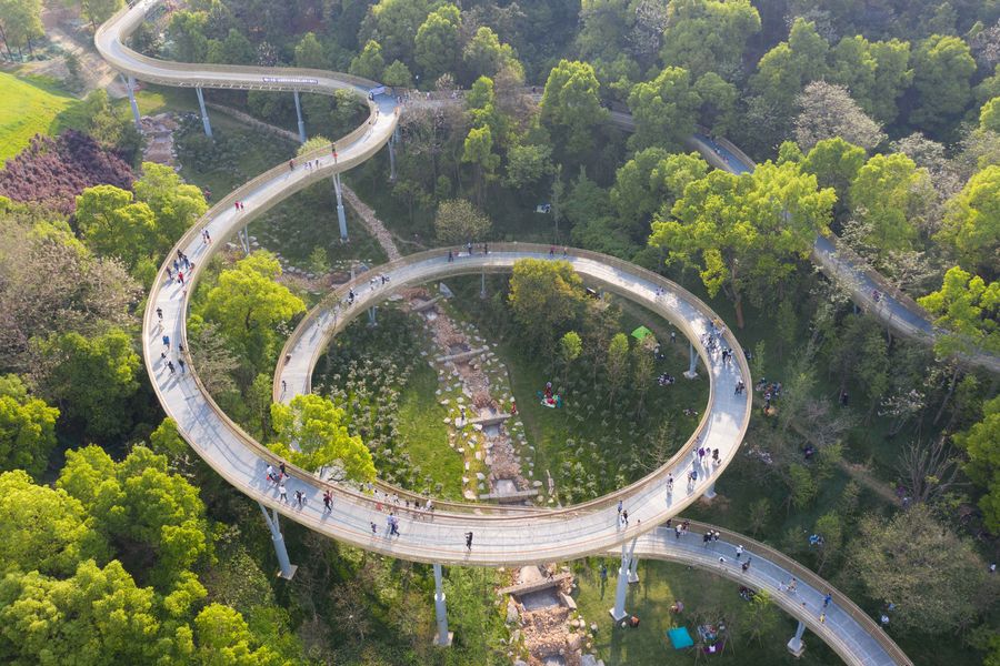 An aerial view of the skywalk in Nanchang City, east China's Jiangxi Province on April 9, 2020. (Xinhua/Zhou Mi)