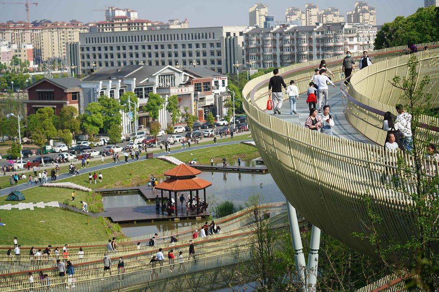 Citizens are having fun on the skywalk in Nanchang City, east China's Jiangxi Province on April 9, 2020. (Xinhua/Zhou Mi)