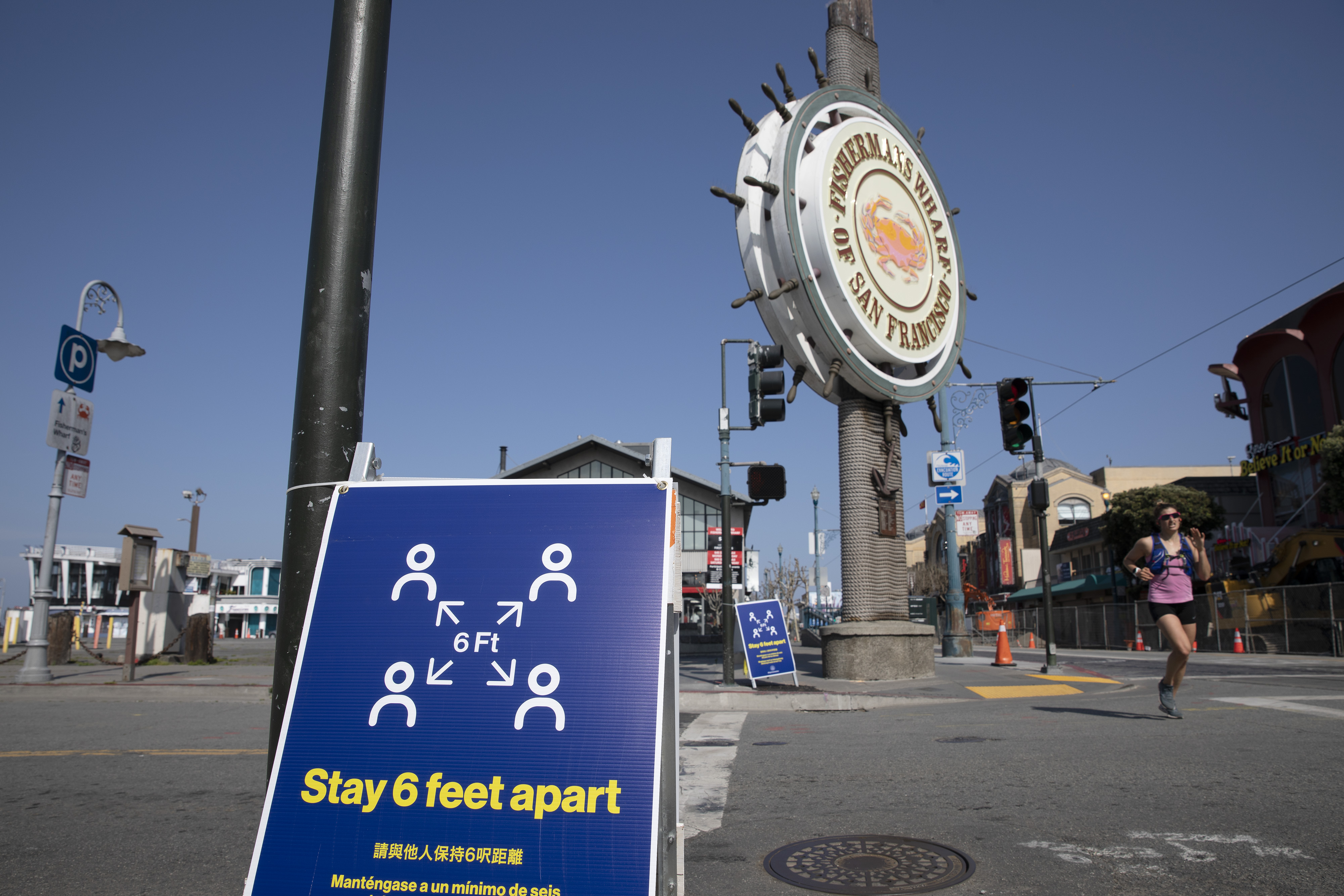 Photo taken on April 12, 2020 shows a board reminding people to keep social distancing at the Fisherman's Wharf amid COVID-19 outbreak in San Francisco, the United States. (Photo by Li Jianguo/Xinhua)