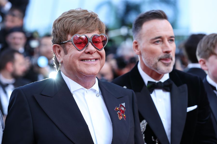 Producer Elton John (L) poses on the red carpet for the premiere of the film "Rocketman" at the 72nd Cannes Film Festival in Cannes, France, on May 16, 2019. (Xinhua/Zhang Cheng)