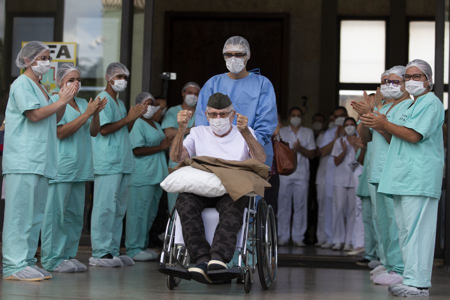 Ernando Piveta (C), a 99-year-old Brazilian World War II veteran, is discharged from the Armed Forces Hospital after recovering from the COVID-19 in Brasilia, Brazil, April 14, 2020.