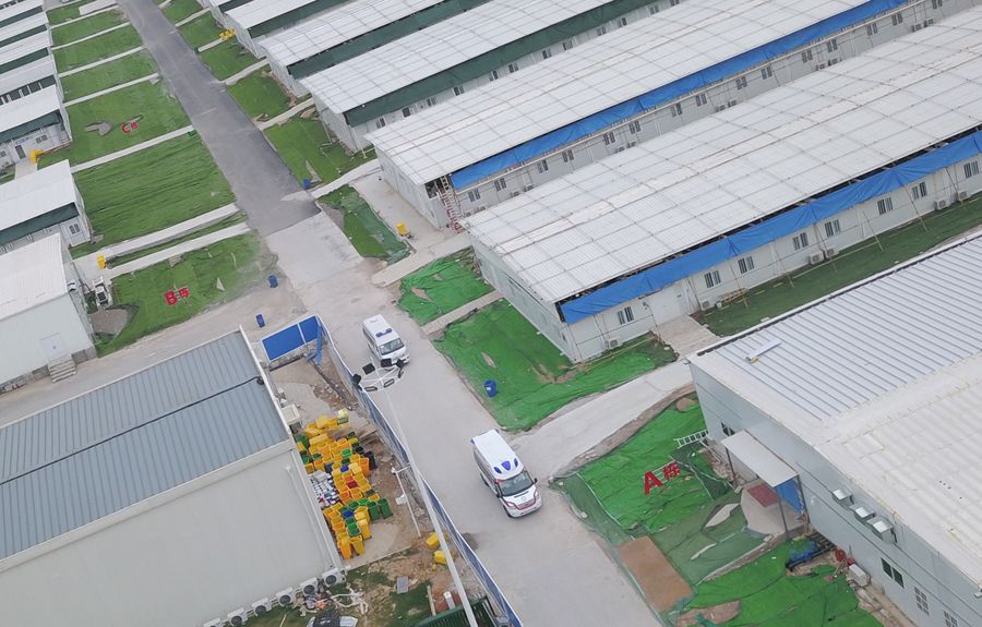 Aerial photo taken on April 14, 2020 shows ambulances transferring the last batch of COVID-19 patients to other hospitals at Leishenshan (Thunder God Mountain) Hospital in Wuhan, central China's Hubei Province. (Xinhua/Cheng Min)