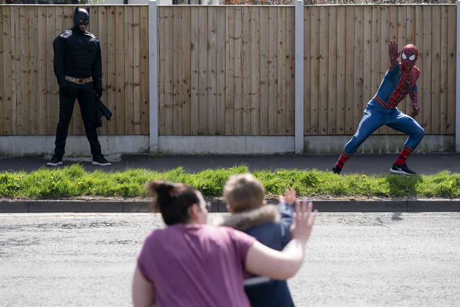 Jason Baird, who runs a martial arts academy in South Manchester, dressed up as Spider-Man, entertains the public amid the COVID-19 outbreak in Manchester, Britain on April 13, 2020. (Photo by Jon Super/Xinhua)