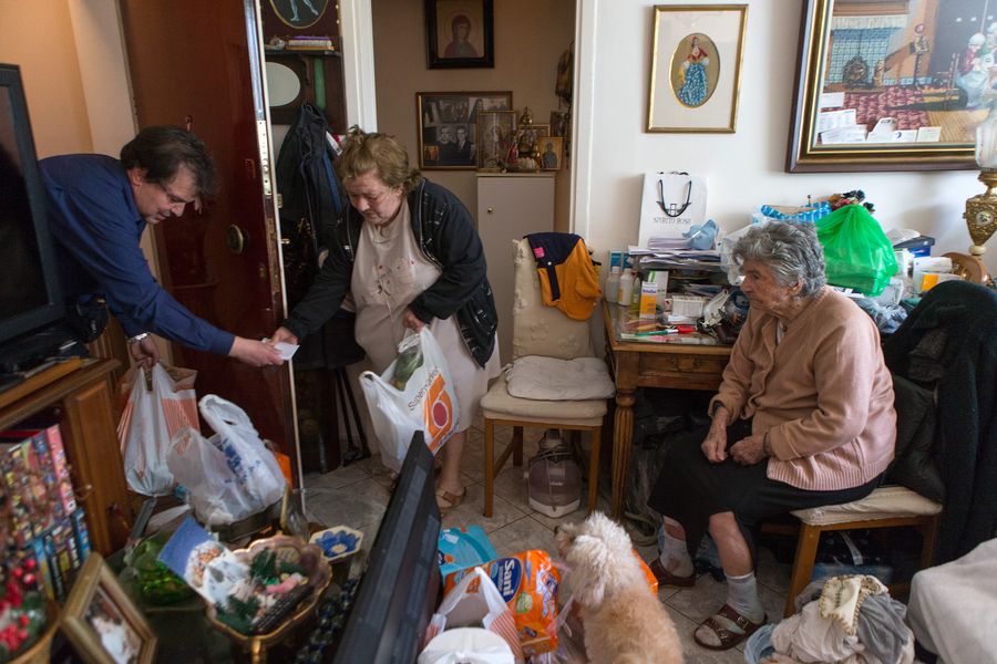 Greek pensioner Aspasia Tampouratzi (C) and her flat mate receive essentials from "Help at Home" program of the municipality of Nea Smyrni, in Athens, Greece, on April 14, 2020.