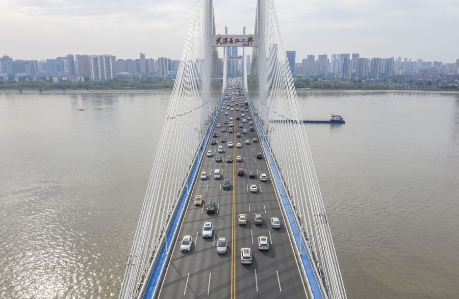 Aerial photo taken on April 14, 2020 shows vehicles passing on the Second Yangtze River Bridge in Wuhan, capital of central China's Hubei Province. (Xinhua/Cai Yang)