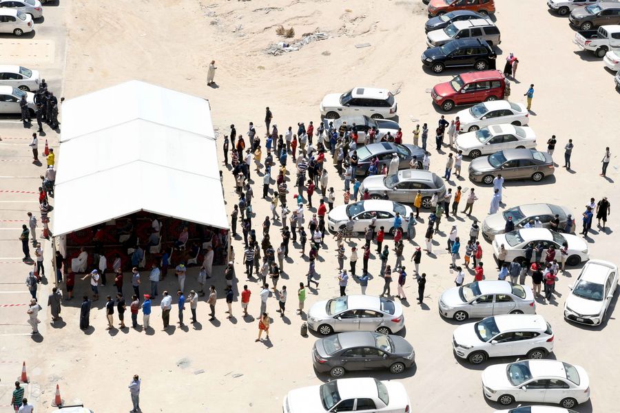 Residents queue up to enter a new store for shopping in Mahboula area, which is under lockdown due to the coronavirus, of Ahmadi Governorate, Kuwait, April 14, 2020.