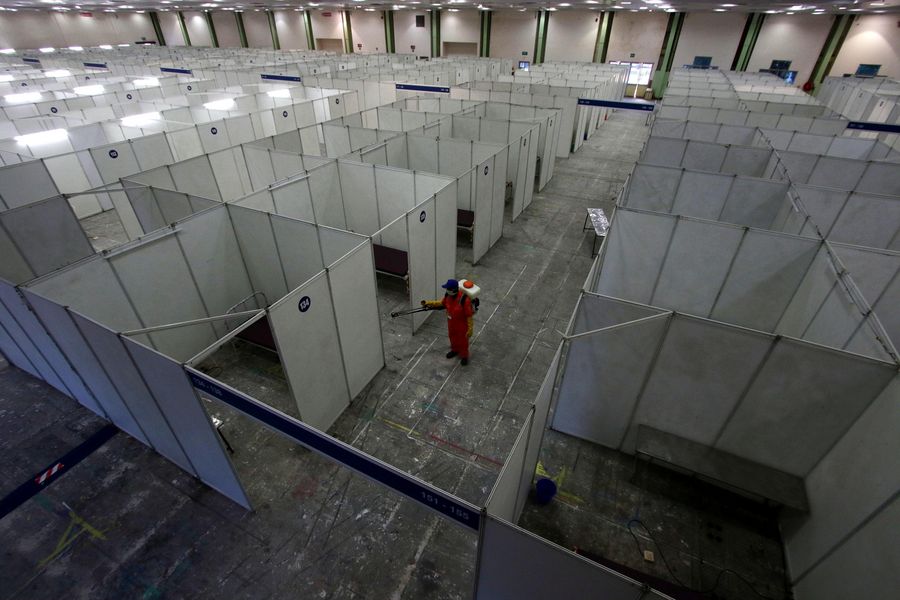 A municipal worker sprays disinfectant at a makeshift isolation hospital for COVID-19 patients in Chennai, India, April 14, 2020. (Str/Xinhua)