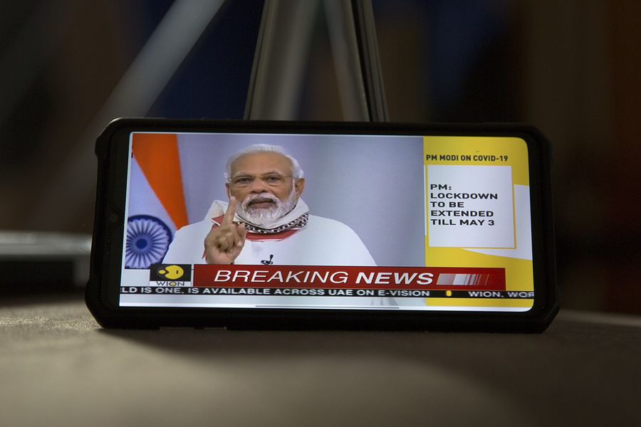 A footage on a mobile phone shows Indian Prime Minister Narendra Modi addressing the nation in a televised speech in New Delhi, India, April 14, 2020. Modi on Tuesday extended the countrywide lockdown till May 3 amid the COVID-19 pandemic. (Xinhua/Javed Dar)