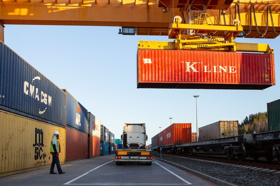 The "China Post" CR Express 1st block train is unloading in Vilnius, Lithuania, April 14, 2020.