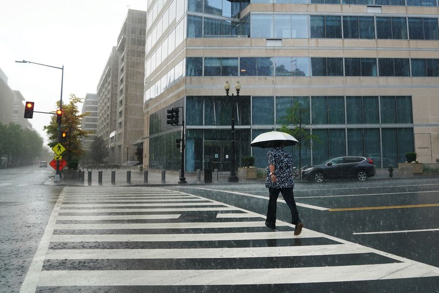 A man crosses a road in the rain near the International Monetary Fund (IMF) Headquarters in Washington D.C., the United States, April 13, 2020.