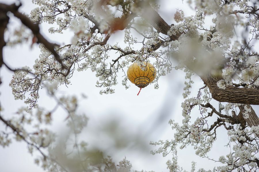 Photo taken on April 13, 2020 shows blooming pear trees in Shichuan Township of Gaolan County, northwest China's Gansu Province.