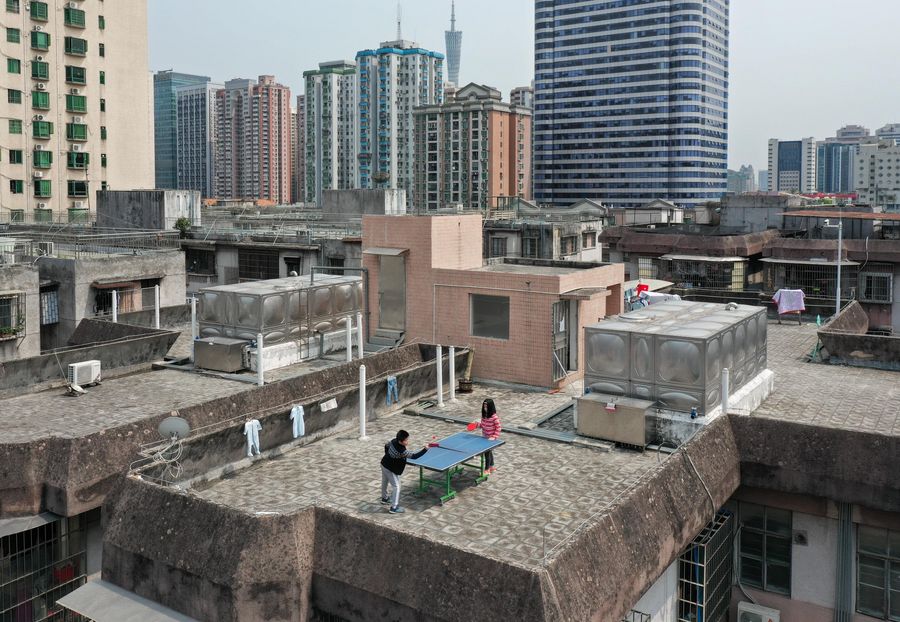Aerial photo taken on April 10, 2020 shows Children playing table tennis on a roof of a residential building in Guangzhou, south China's Guangdong Province. (Xinhua/Liu Dawei)
